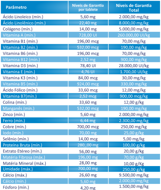 Óleo de Girassol Refinado (Helianthus sp.), Biomassa de Microalgas (Schizochytrium sp.), Farinha de Linhaça (Linumusitatissimum), Colágeno Hidrolisado, Vitamina A, Vitamina B1, Vitamina B2, Vitamina B6, Vitamina B12, Vitamina D3, Vitamina E, Vitamina K3, Vitamina B5, Ácido Fólico, Vitamina B7, Cloreto de Colina, Sulfato de Manganês, Sulfato de Zinco, Sulfato Ferroso Monohidratado, Sulfato de Cobre Pentahidratado, Iodato de Cálcio, Selenito de Sódio, Hemoglobina Desidratada de Bovino, Hidrolisado de Fígado de Suínos, Fressura de Suínos, Quirera de Arroz, Farelo de Trigo, Fosfato Bicálcico, Cloreto de Sódio, Glicerina, Açúcar de cana-de-açúcar, Nitrito de Sódio, Ácido Cítrico, Tripolifosfato de Sódio, DL-Alfa-Tocoferol, Propionato de Cálcio, Ácido Pirolenhoso, Sorbato de Potássio, Eritorbato de Sódio, Extrato de Cravo da Índia (Caryophyllus aromaticus) e Óleo de coco (Cocos nucífera).