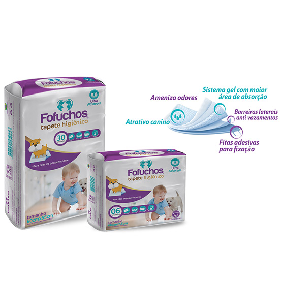 Tapete higiênico Fofuchos é um tapete higiênico indicado para educação sanitária de cães, com gel super absorvente tanto para adultos como para filhotes. Com atrativo canino para o seu cão sempre usar o tapete, abas laterais, ranhuras, adesivo no tapete para fixá-lo no chão, vedação especial e gel absorvente, que deixa o ambiente sempre limpo elimina odores desagradáveis.